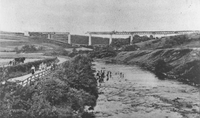 Stonehouse Viaduct was of similar construction to the Larkhall viaduct being built between 1903and 1904. This was an eight span steel truss bridge built level on a curve 158 feet above the river, 457 yards long and contained 2273 tons of steel. Both Larkhall and Stonehouse viaducts were built by Arrol Bros at Germiston works Glasgow, incorporating expansion joints on the tops of the piers to allow for the creep of the steel during hot weather. Whilst the viaducts were built wide enough for double tracks, only single track was ever laid on them. Most of the construction workers were Irish labourers. These new single track lines were operated by the electric token block system between the crossing places.