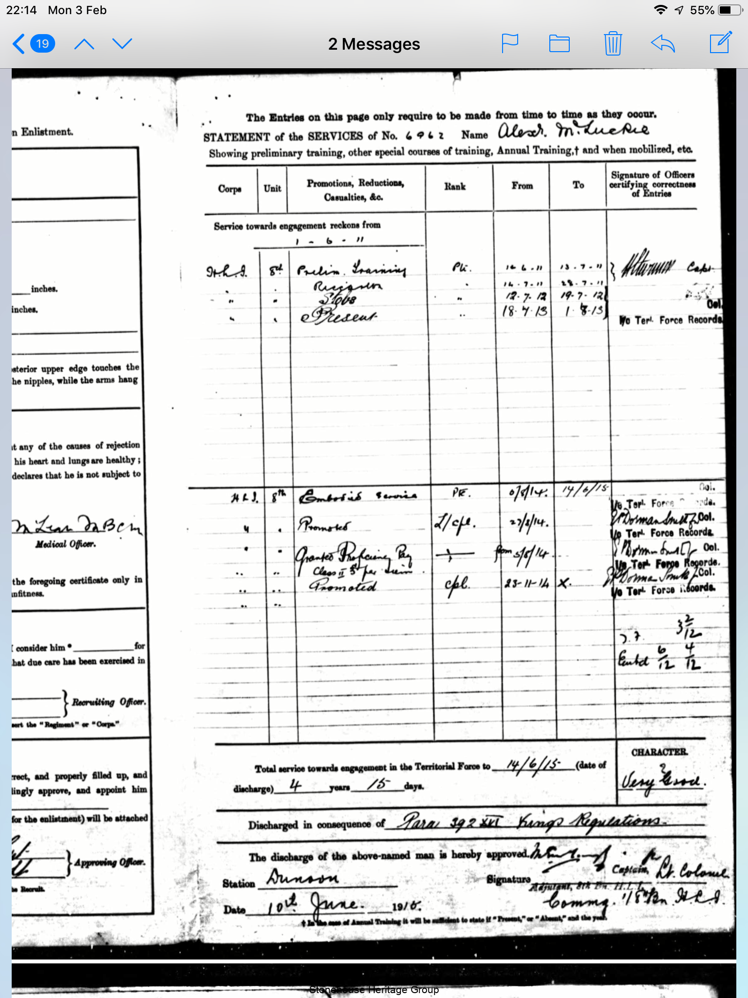 Alex signed up on 1st June 1911, and was discharged on 14-06-1915 under kings regulations due t having had a finger removed following an old mining injury however email correspondence from family indicate that he signed up again with the Cameronian Scottish rifles .