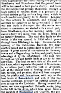 Limestone Kilns (736 455): located below the road between Stonehouse and the Avon bridge were used to burn limestone quarried locally from the Hurlet Limestone to provide lime used to improve the quality of agricultural land.