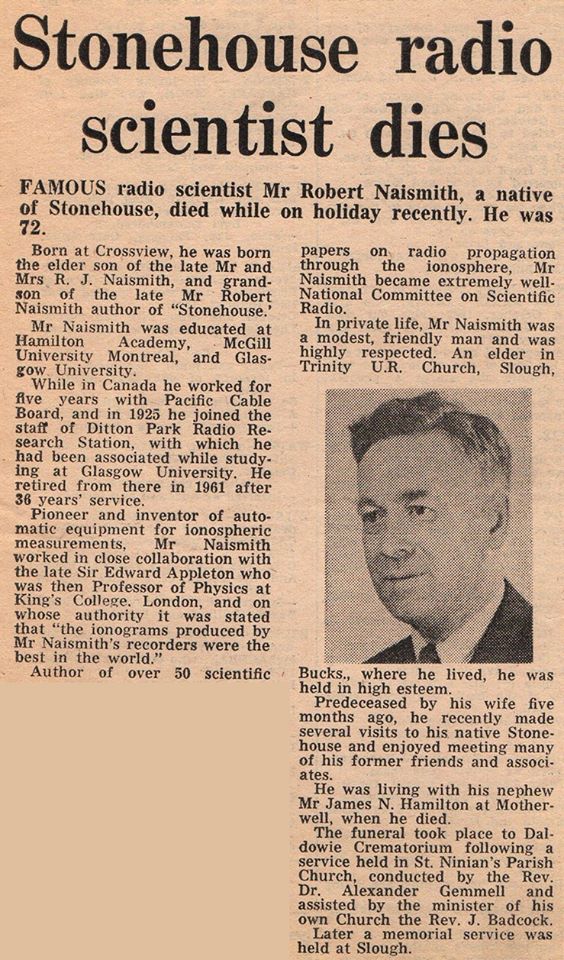 Grandson of Robert Naismith *(author and draper) , also born at Crossview, was a famous radio scientist. He was a pioneer and inventor of automatic equipment for ionospheric measurements and a member of Sir Robert Watson-Watt’s team in radar research before and during the war, as well as author of a number of scientific publications. His death in 1973 marked the end of this branch of the Naismith family.