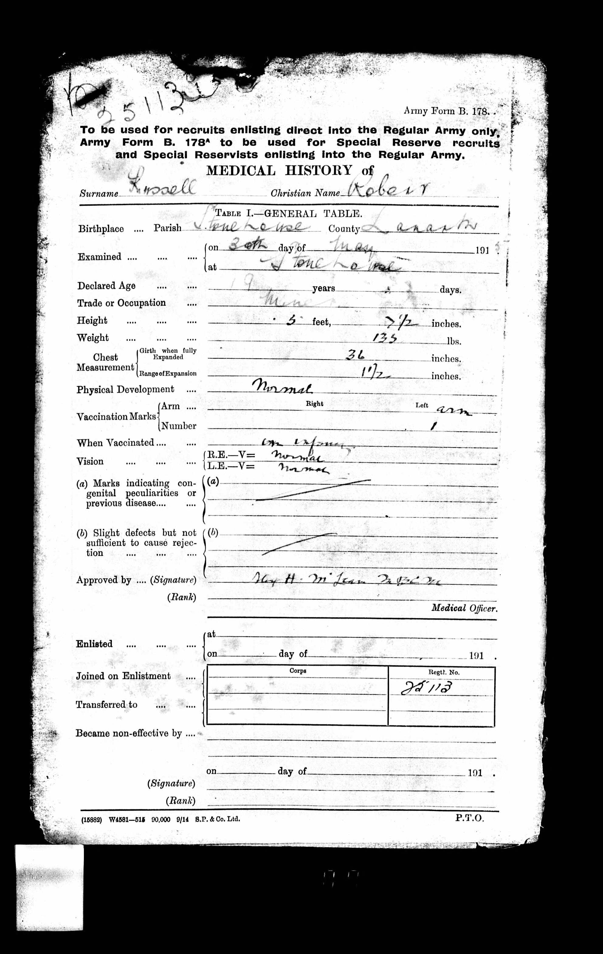 Robert enlisted at Hamilton on 31-05-1915 whilst residing at in Stonehouse. Embarked from Southampton as part of the British Expeditionary Force on 08-01-1916.