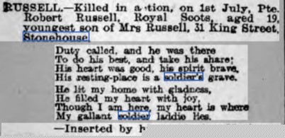 Robert was born in Stonehouse, son of Mrs Martha Russell 31 King street  Stonehouse  with brothers James, Thomas and William. Brother James was staying in Teralba Newcastle New South Wales Australia. Sister was Mary Weir 28 Lockhart street  Lanarkshire.