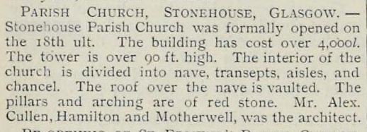 Following the closure of the “Village Kirk” St Ninians Church, known as the New Kirk, first opened its doors on 18 December 1897. The church was designed by Alexander Cullen Architect. The following is an extract from the builder.