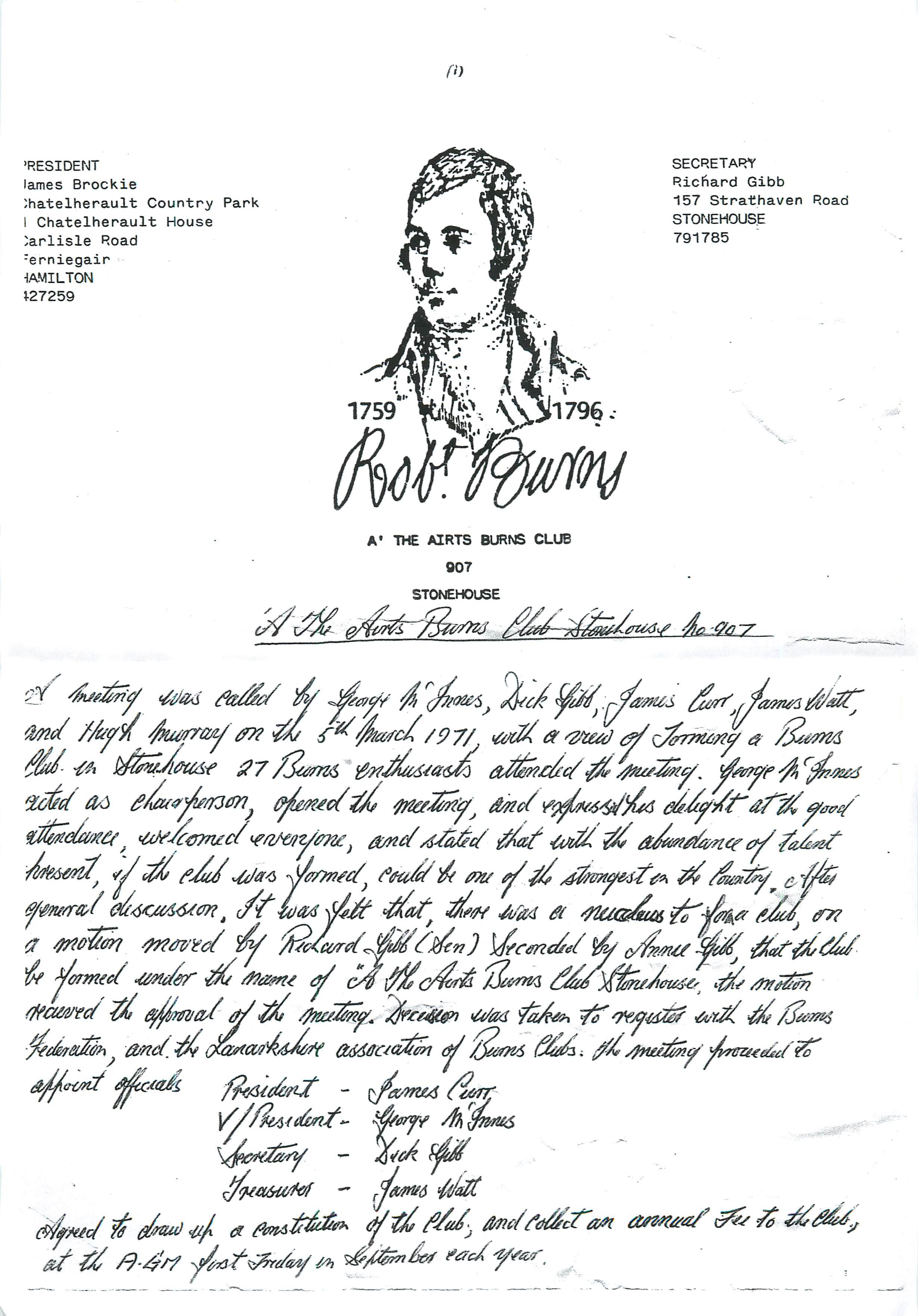 We have documentation that outlines the formation of the Airts Society when 0n 5th March 1971 George McInness, Dick Gibb, James Curr, James Watt and Hugh Murray held a meeting between 27 Robert Burns enthusiasts whereby they formed the “A the Airts Society”. At this meeting the following were elected as committee members.