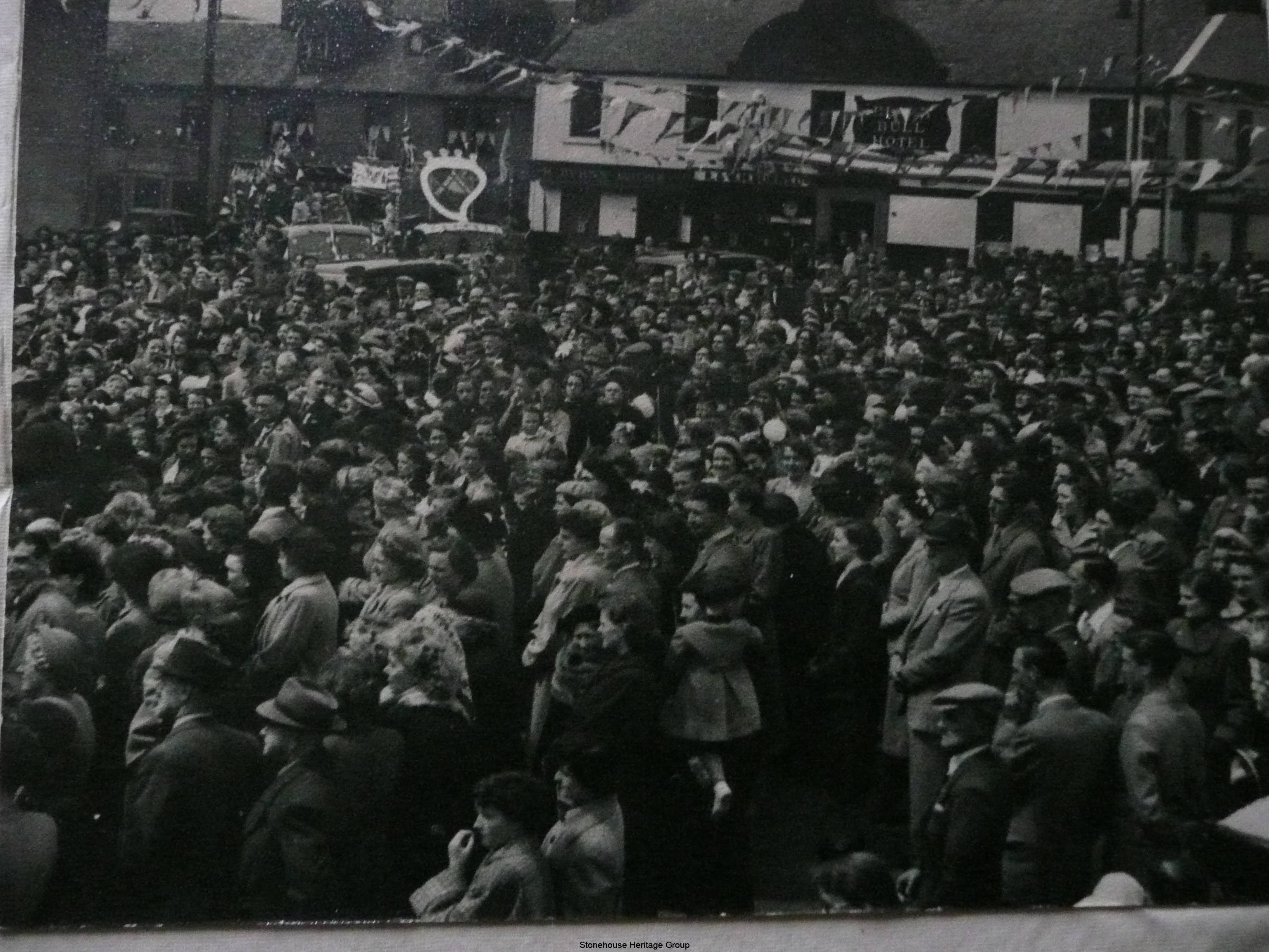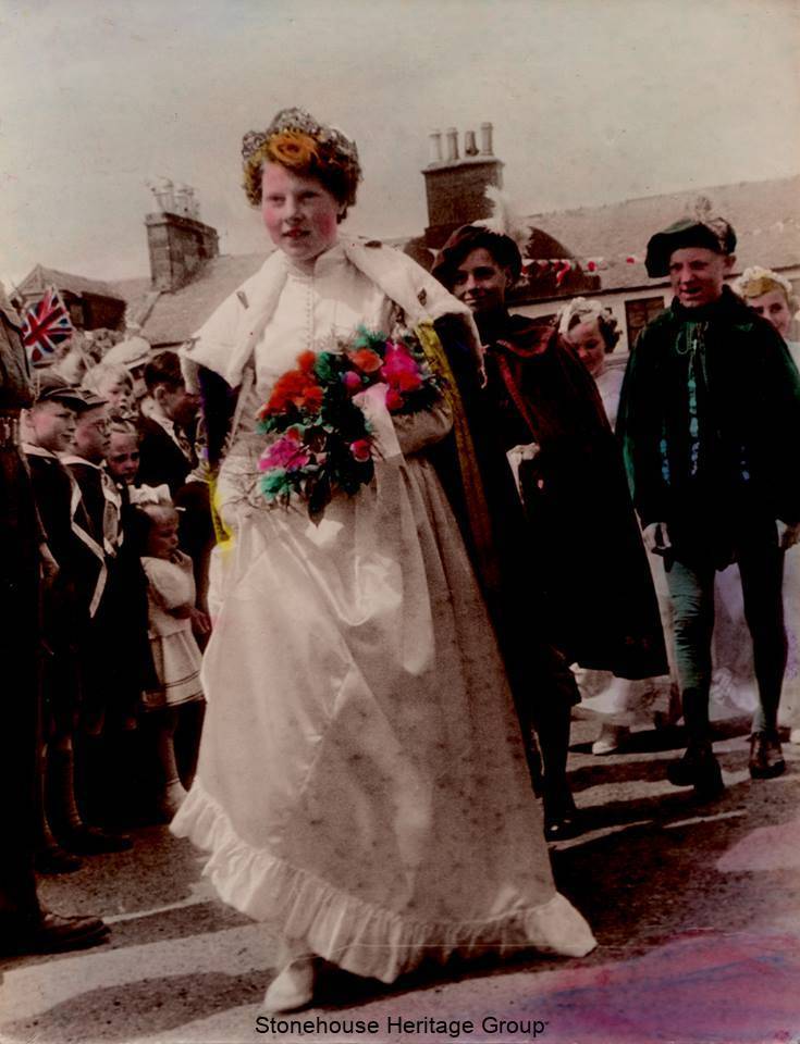The Gala Queen during the late 1940’s was called the ‘Queen of the Roses’. The first Queen recorded in 1948 was Anne Elliot and her Champion was James Aitken. The venue of the crowning ceremony was the bandstand in the public park.  Following the ceremony the Queen and Court would  visit Stonehouse Hospital, a tradition still upheld today although this now incorporates the nursing homes.   On Gala day, inscribed commemorative medals were presented to the Queen and Court. Food rationing was still in force so application to the food office was essential to produce supplies for the large gathering of people attending the event.