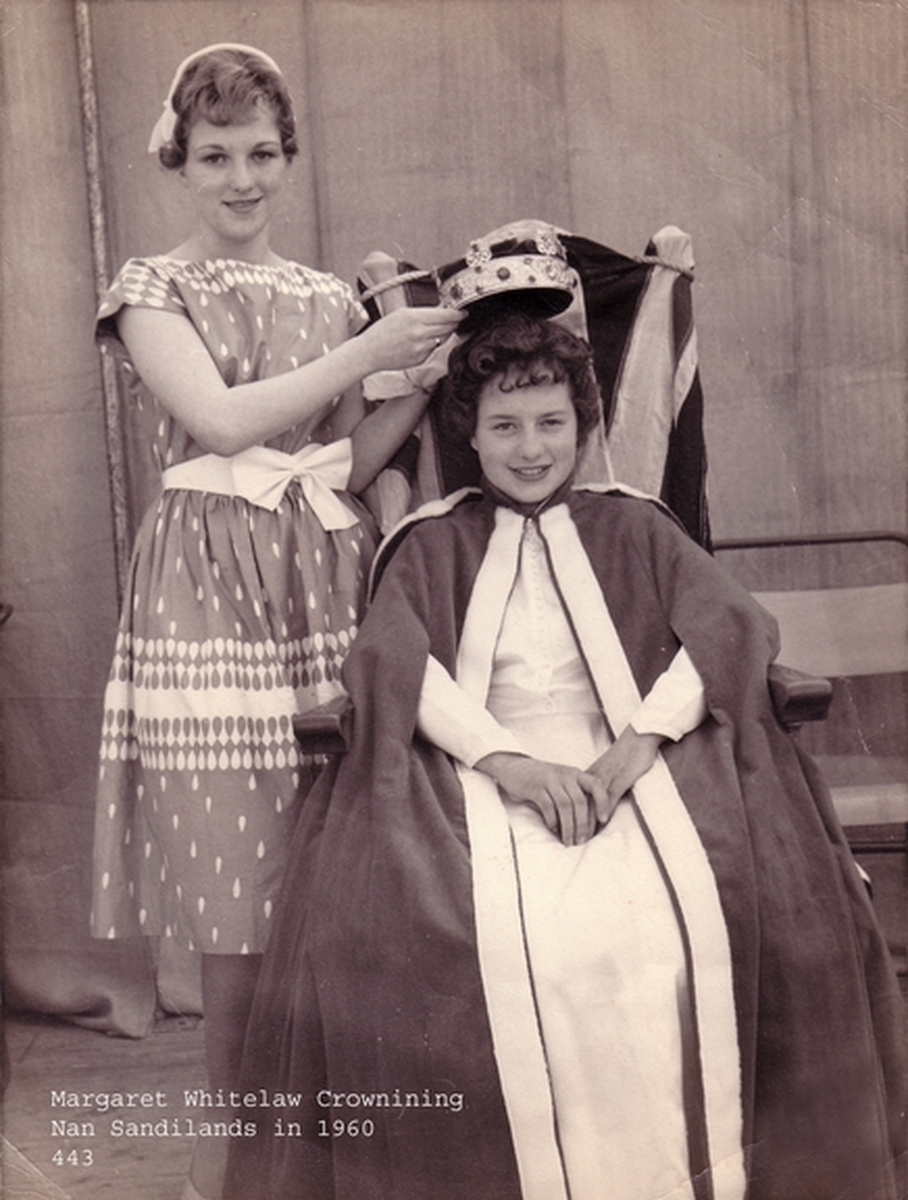 The Gala Queen during the late 1940’s was called the ‘Queen of the Roses’. The first Queen recorded in 1948 was Anne Elliot and her Champion was James Aitken. The venue of the crowning ceremony was the bandstand in the public park. Following the ceremony the Queen and Court would visit Stonehouse Hospital, a tradition still upheld today although this now incorporates the nursing homes. On Gala day, inscribed commemorative medals were presented to the Queen and Court. Food rationing was still in force so application to the food office was essential to produce supplies for the large gathering of people attending the event.