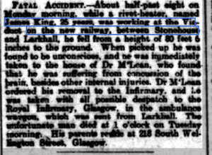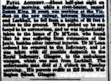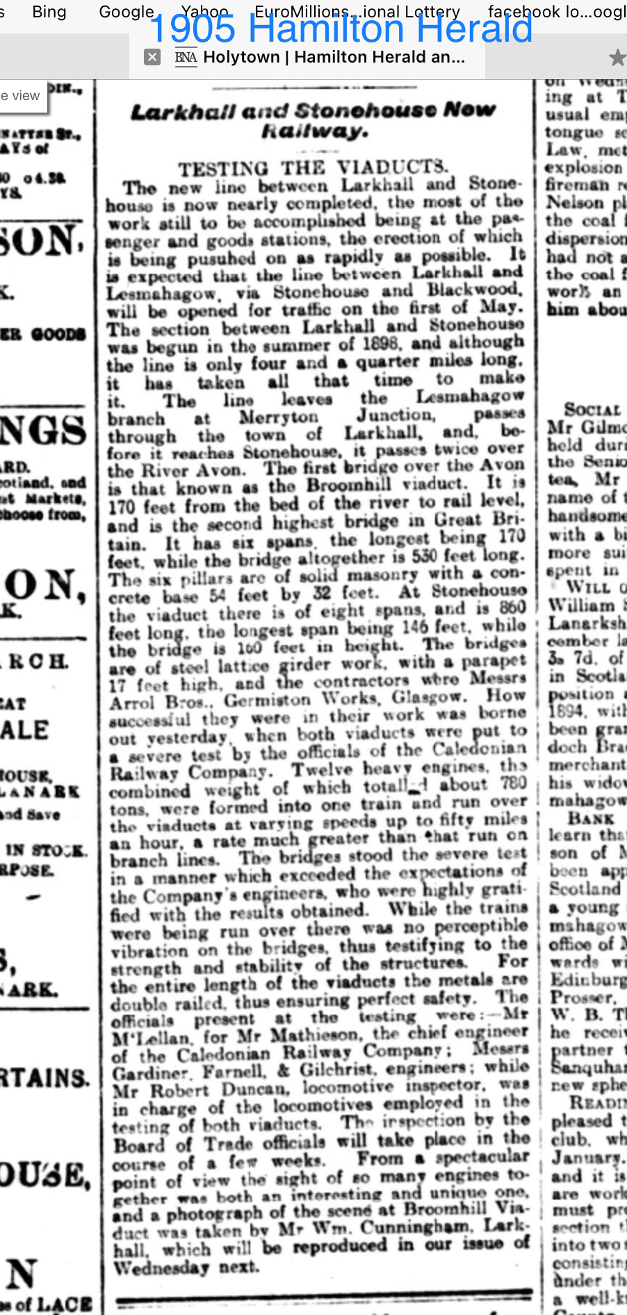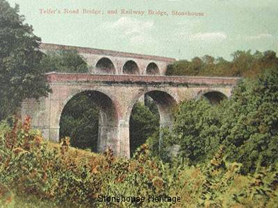 Stonehouse Viaduct was of similar construction to the Larkhall viaduct being built between 1903and 1904. This was an eight span steel truss bridge built level on a curve 158 feet above the river, 457 yards long and contained 2273 tons of steel. Both Larkhall and Stonehouse viaducts were built by Arrol Bros at Germiston works Glasgow, incorporating expansion joints on the tops of the piers to allow for the creep of the steel during hot weather. Whilst the viaducts were built wide enough for double tracks, only single track was ever laid on them. Most of the construction workers were Irish labourers. These new single track lines were operated by the electric token block system between the crossing places.