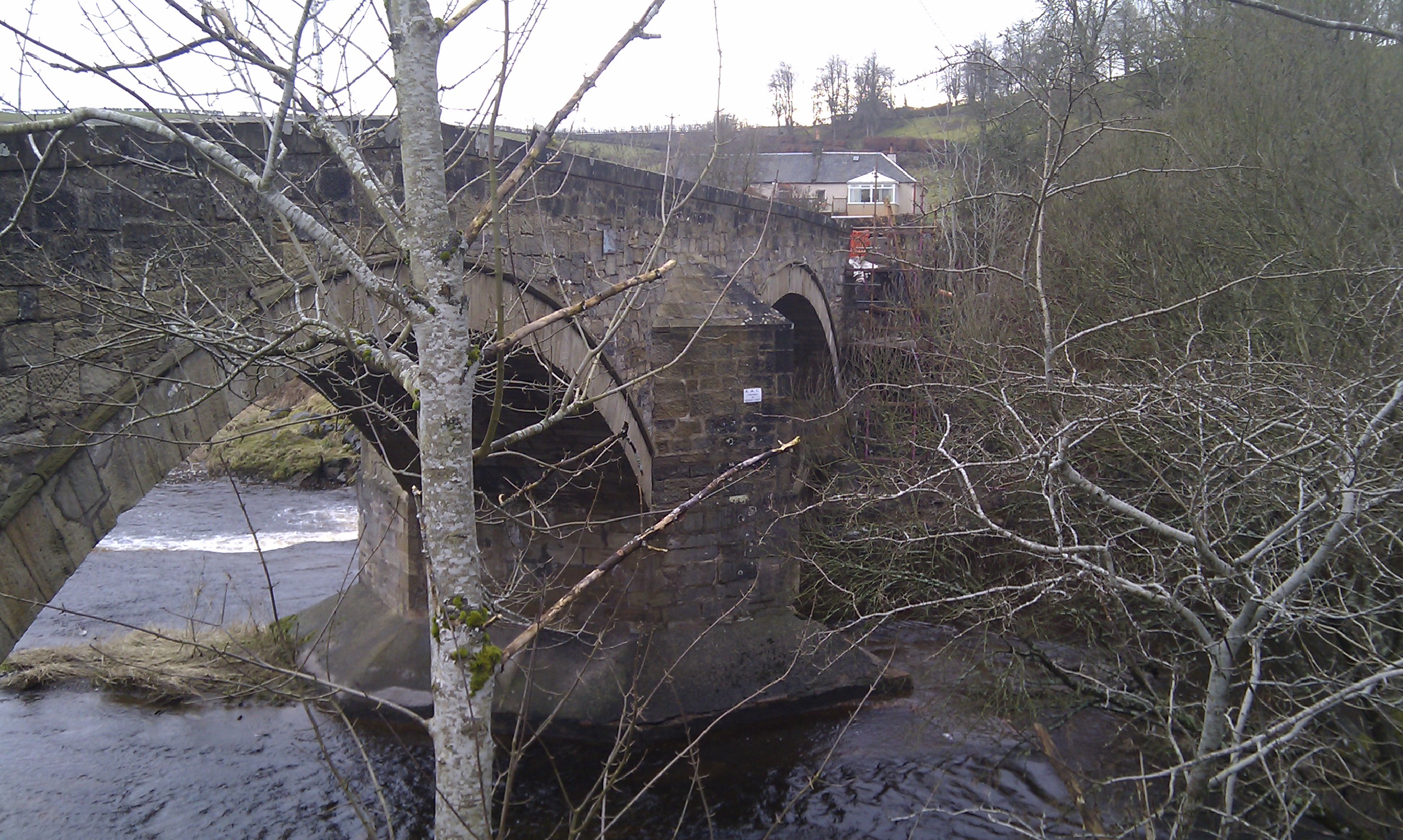 Linthaugh bridge,spanning the river Avon has two arches with a centre cutwater. Thought to be built around  late 18th-early 19th century is located on the Larkhall Millheugh Road, South Lanarkshire ML9 3PQ. Throughout its long history  it has served the village of Stonehouse  well and been  a popular alternative route for accessing Hamilton, Quarter and outlying villages. Not the first bridge over the Avon in this location as its been reported that in 1771, two bridges including Linthaugh Bridge were swept away by floods. The Linthaugh Bridge was rebuilt some time after this and its not known if this is the current bridge that was built after the floods.  In recent years its been in constant need of repair, the bridge was, for a decade, merely an access for farmers and fishermen, when a landslide on the Millheugh Road resulted in its closure. However, Millheugh Road was reopened in 1998 after a long fought campaign by residents, the community council and local councillors.  Closed again in 2011 -2012 following the discovery of some cracks additional work was carried out.