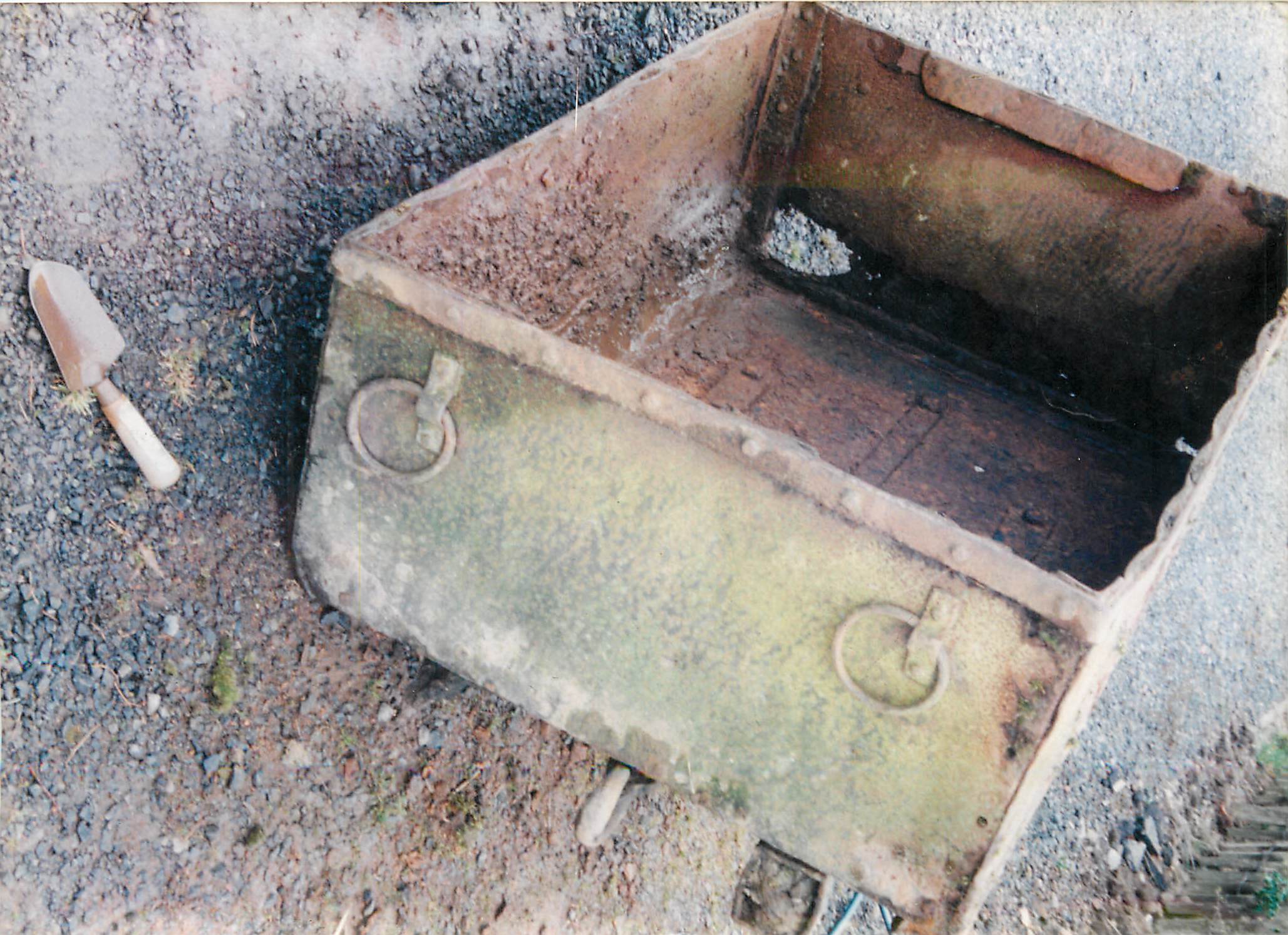 Around 1995 a number of members from the heritage group retrieved a coal bogie (hutch) from the river Cander near overwood. The attached pictures show the bogie ion various states from its retrevial from the river to new wood for the axles. The repairs were carried out by Douglas Torrance and Robert Freel. The bogie was parked in the garden of 67 King street Stonehouse.