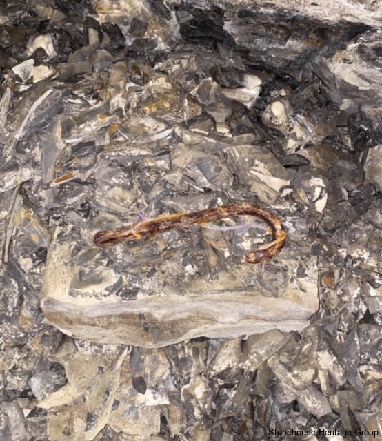 CLAYBAND IRONSTONE – fine grained red/grey/brown sedimentary rock of clay and siderite.  It occurs as nodules, concretions and thin beds associated with coal seams in the Coal Measures.