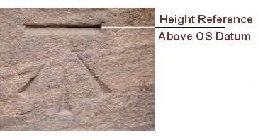 These obscure marks are like secret symbols carved on building and bridges all-round mainland Great Britain . Hidden in plain sight, we walk past them every day without realising what they are and their purpose.   They are usually  cut / carved into sandstone and take  the form of a horizontal line with an arrow pointing up from below. These marks were cut by Ordnance Survey levelling staff to provide a network of points at which height has been precisely measured (to the centre of the horizontal line) above sea level an example of which is detailed below.