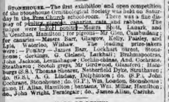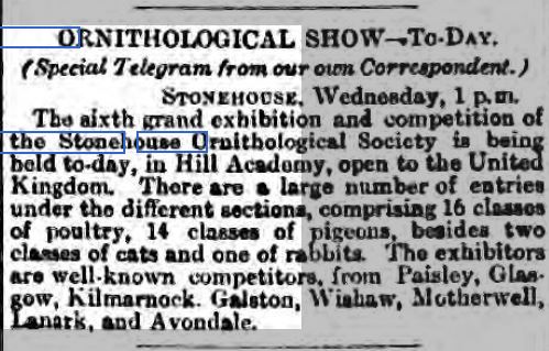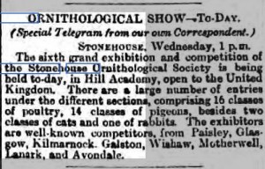 Robert Naismith reports in his book Stonehouse (published 1885) that this society was formed several years ago. From research carried out a newspaper article in the Glasgow Herald on Monday 10th December 1877 it is reported that the society held their first exhibition and from this we can assume that the society was probably formed 1876 or 1877. We also note from a further article that the society held its sixth exhibition on 3rd January, 1883, in the Hill School and this attracted competitors from Paisley, Glasgow, Kilmarnock, Galston, Wishaw, Motherwell, Lanark and Avondale