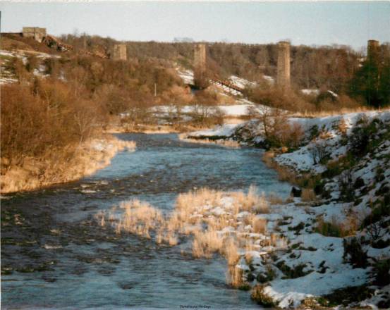 The line from Merryton Junction to Stonehouse required two large viaducts to be built over the valley of the river Avon. Larkhall viaduct is a six span steel truss bridge built on the straight, on a rising gradient of 1 in 80 towards Stonehouse, 530 feet long and 170 feet high. The spans were carried on masonry piers of locally quarried stone, whose foundations sat on a bed of solid rock 60 feet below ground level. The viaduct contained 1399 tons of steel and was reputed to be the highest in Scotland. It was also subject to a speed limit of 15 miles per hour to trains passing over it.
