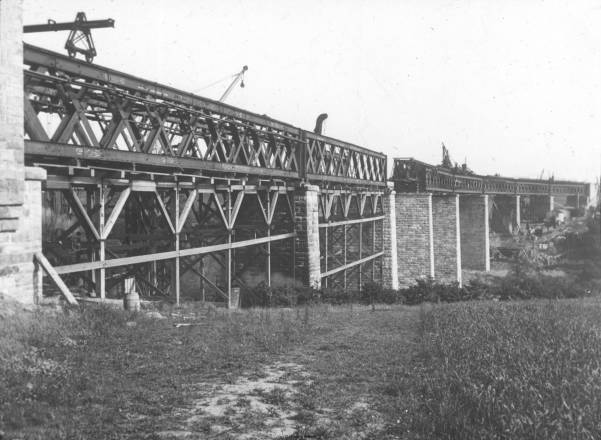 Stonehouse Viaduct was of similar construction to the Larkhall viaduct being built between 1903and 1904. This was an eight span steel truss bridge built level on a curve 158 feet above the river, 457 yards long and contained 2273 tons of steel. Both Larkhall and Stonehouse viaducts were built by Arrol Bros at Germiston works Glasgow, incorporating expansion joints on the tops of the piers to allow for the creep of the steel during hot weather. Whilst the viaducts were built wide enough for double tracks, only single track was ever laid on them. Most of the construction workers were Irish labourers. These new single track lines were operated by the electric token block system between the crossing places.
