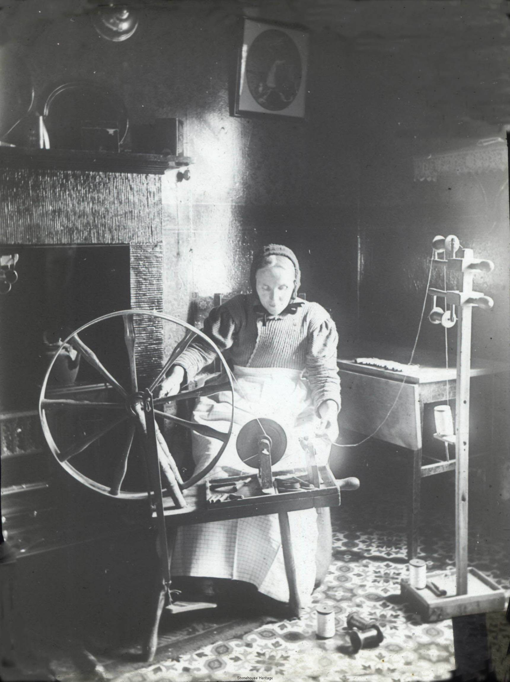 Hand loom weaving was a family business, the trade being handed down from father to son. There was also a great dependency on women in the weaving process, undertaking such tasks as pin winding, tambouring and embroidery.