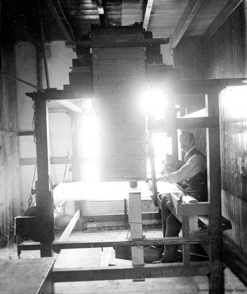 Hand loom weaving was a family business, the trade being handed down from father to son. There was also a great dependency on women in the weaving process, undertaking such tasks as pin winding, tambouring and embroidery.